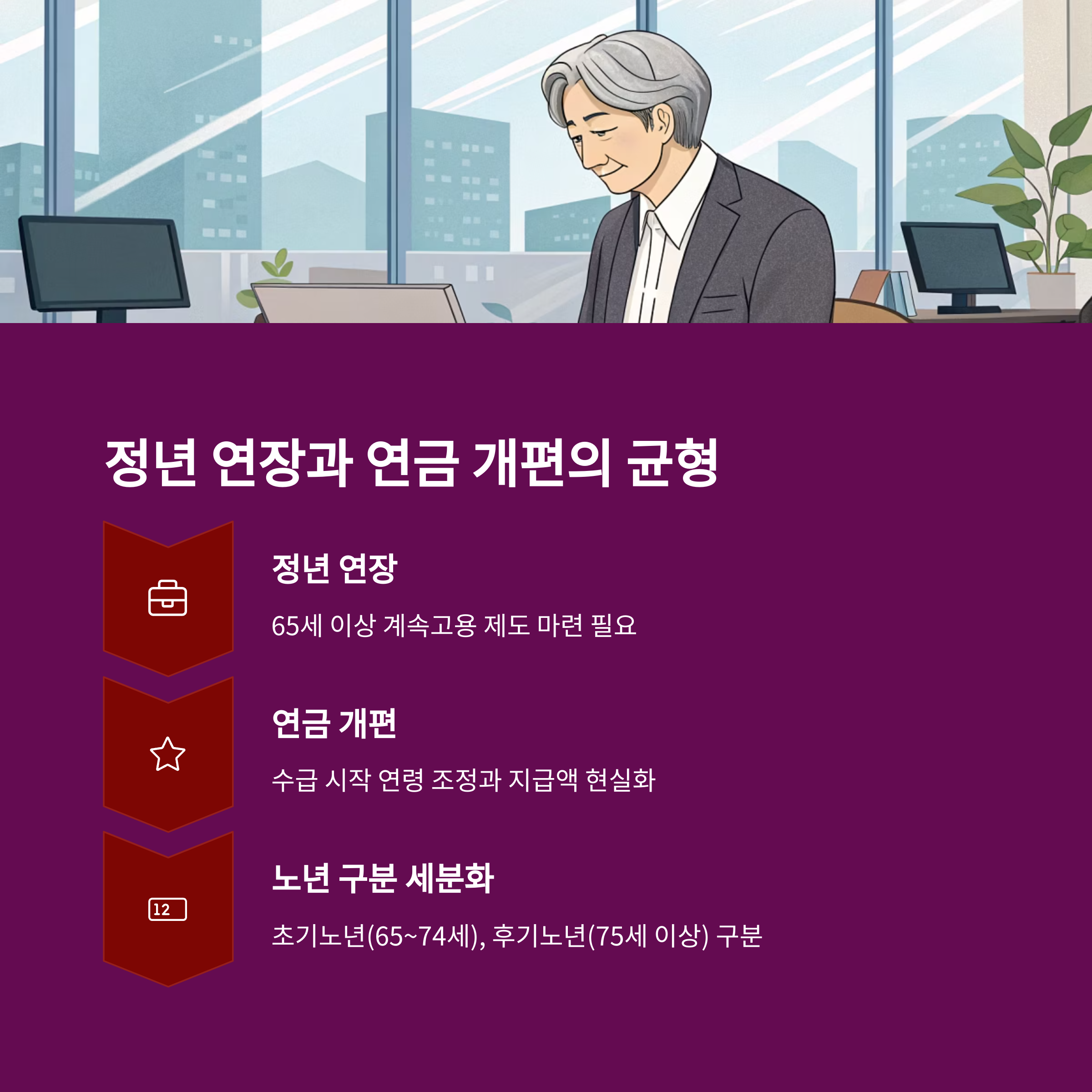 정년 연장이나 재고용제도, 고령자 일자리 지원 등 고용 연장 대책이 필수입니다.