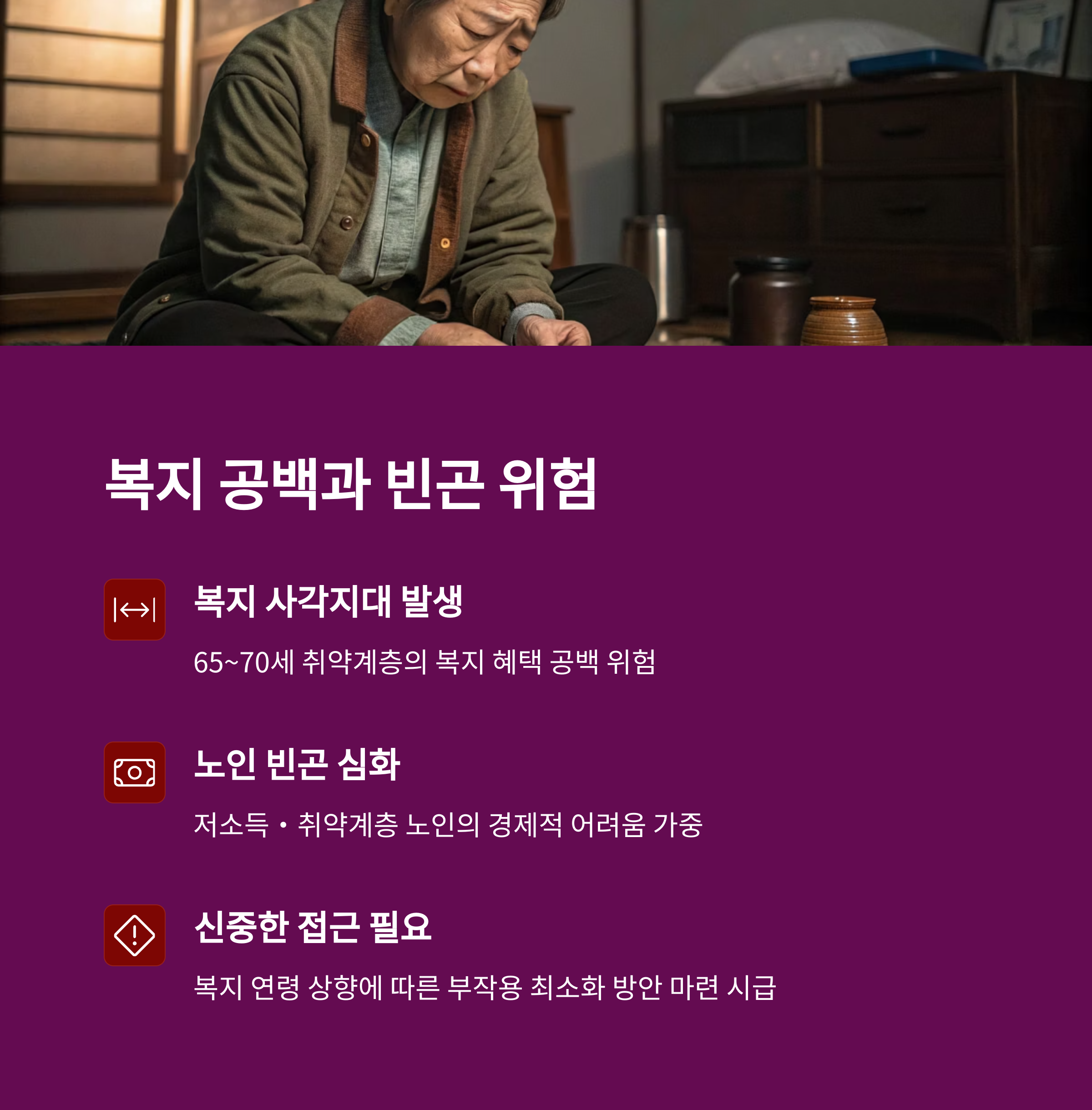 노인 기준이 상향되면, 복지 수급자에서 배제되는 계층이 발생할 수 있습니다.