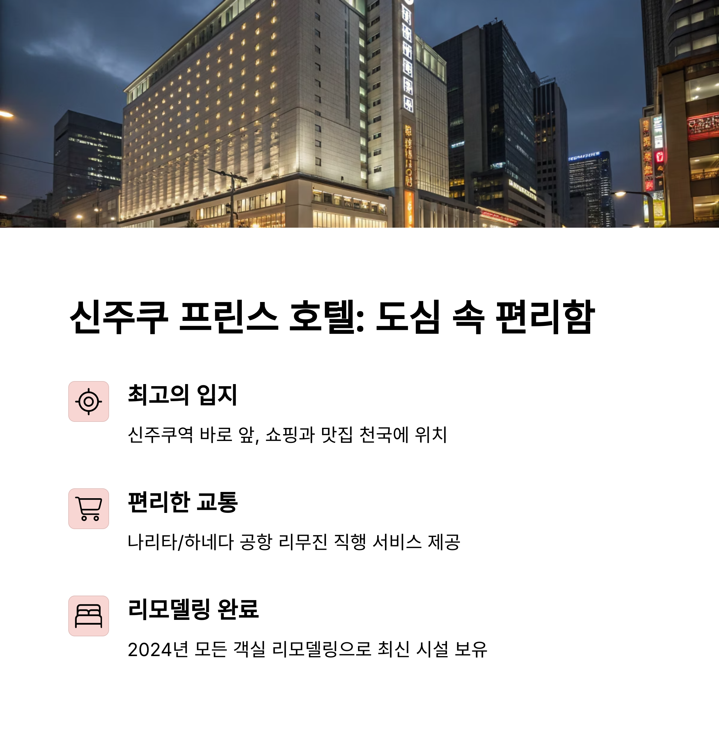 - 첫째, 도심 관광과 쇼핑을 중심으로 빠르게 움직이고 싶은 여행자라면 신주쿠 프린스 호텔이 정답입니다.