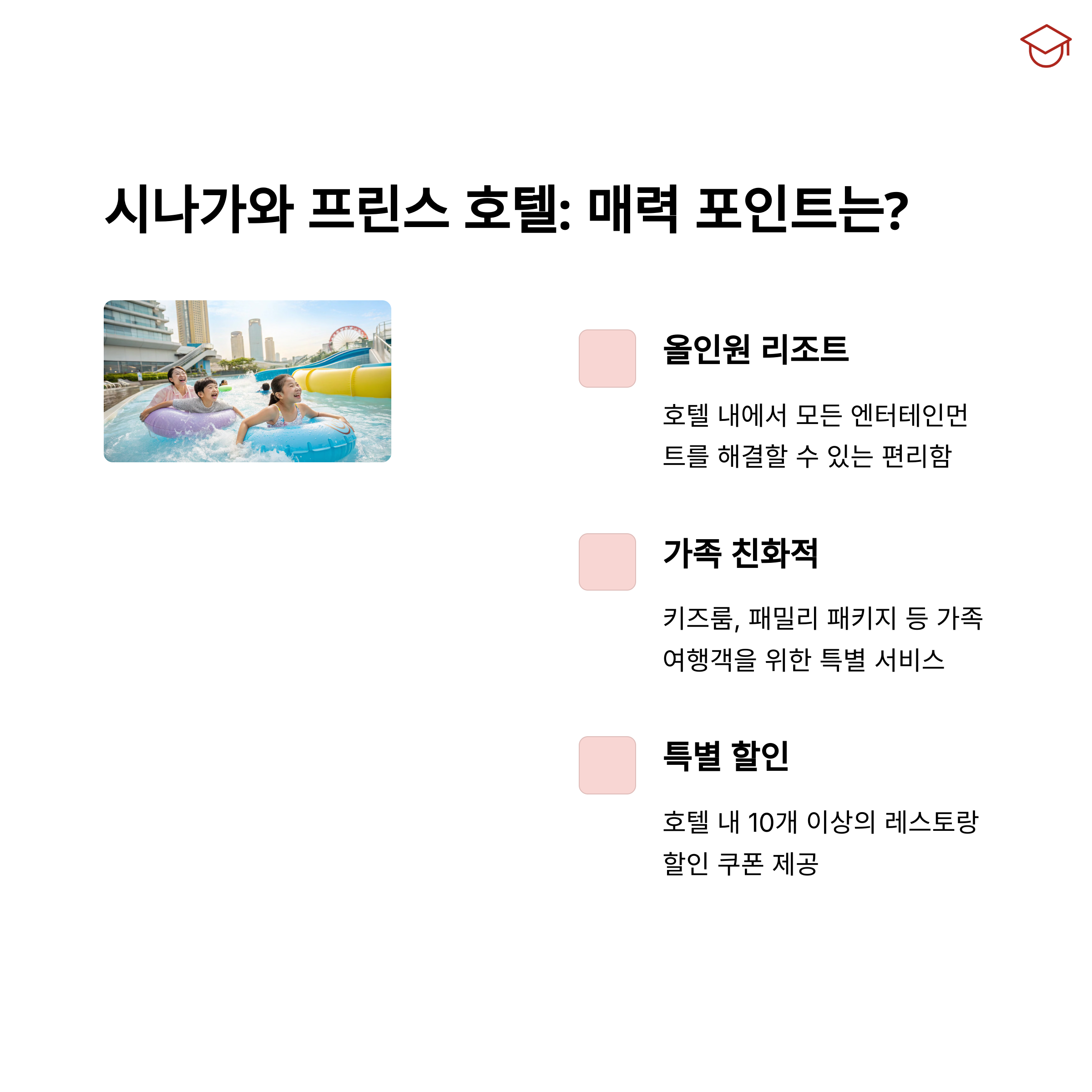 - 둘째, 다양한 객실 타입과 부대시설로 가족과 단체에 매우 적합