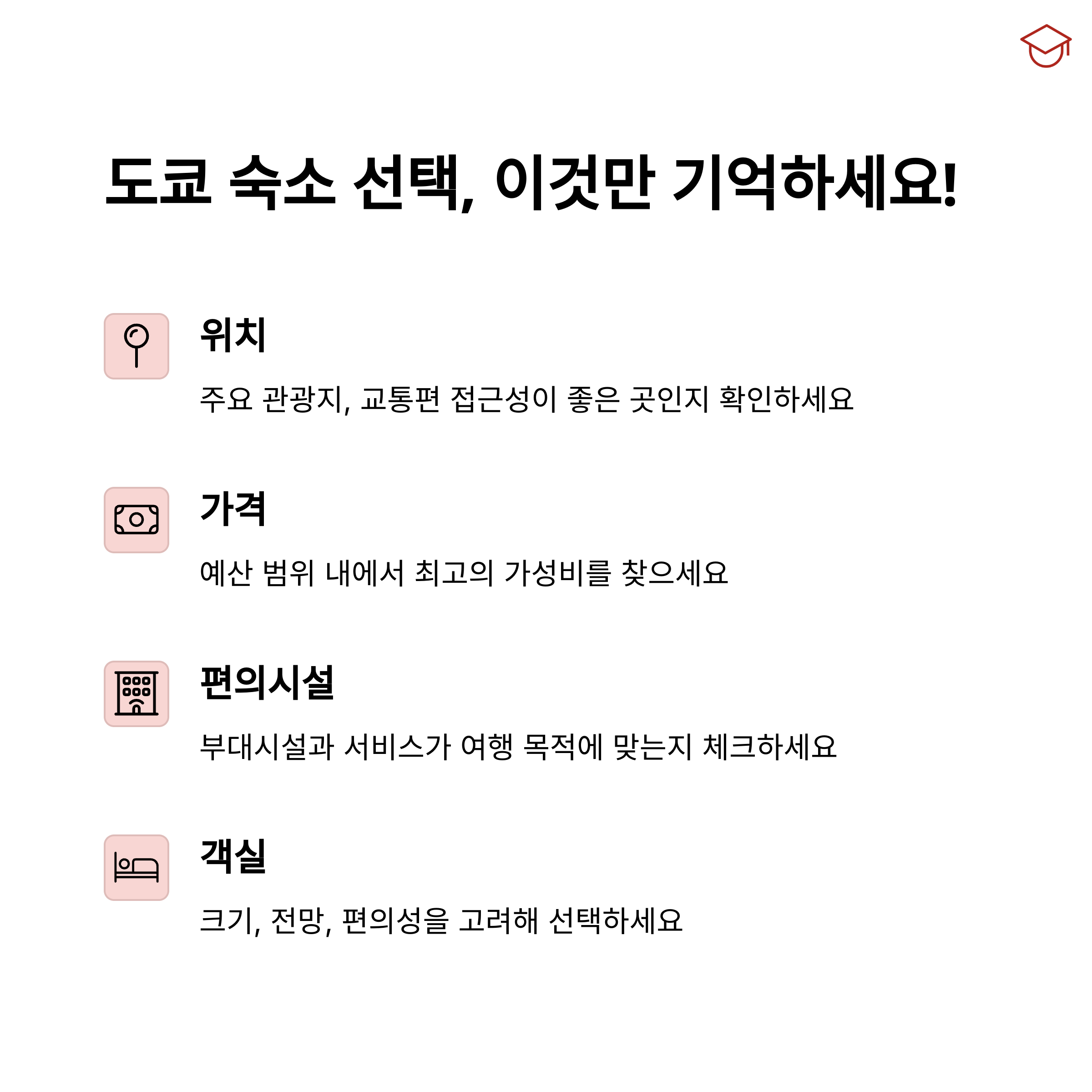 도쿄에서 숙소를 선택할 때는 교통 접근성, 주변 편의시설, 객실 상태, 여행 스타일에 맞는지를 꼼꼼히 따져야 합니다.