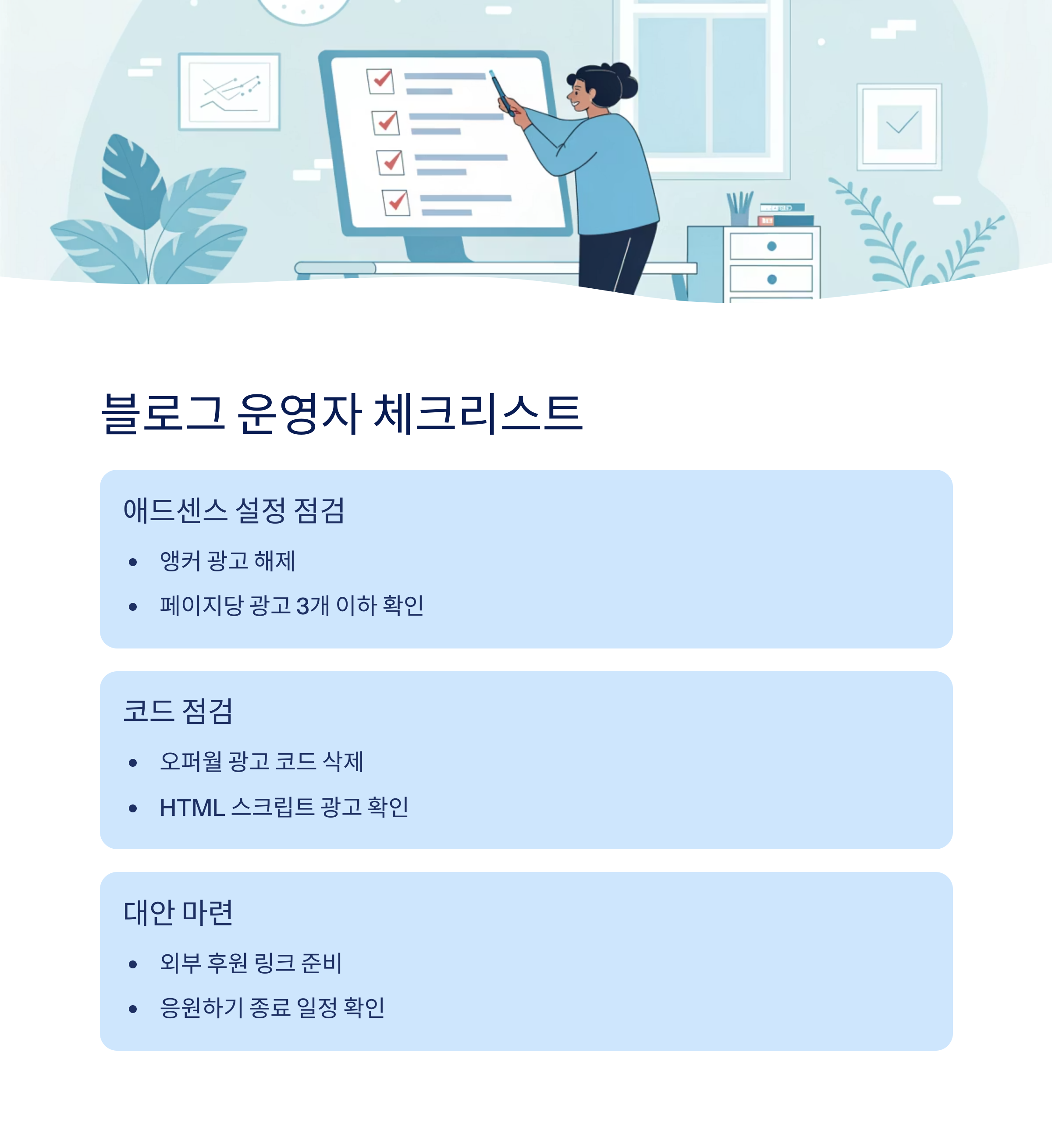 "위 체크리스트를 기준으로 블로그를 점검하세요. 한 번의 실수로 수익이 사라질 수 있습니다."