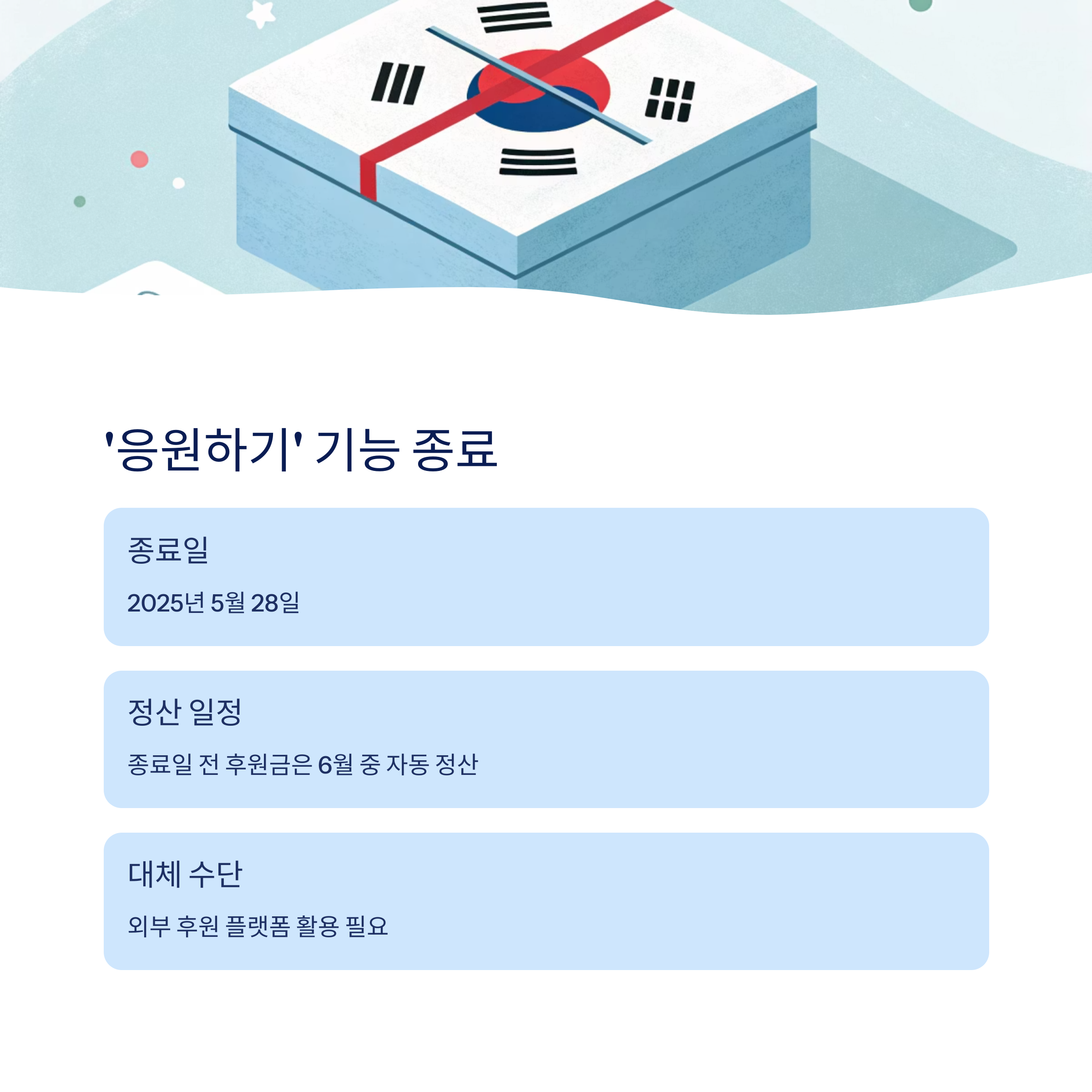 응원하기 종료 | 후원 기능 중단, 기존 응원금은 정산 | 2025년 5월 28일 |