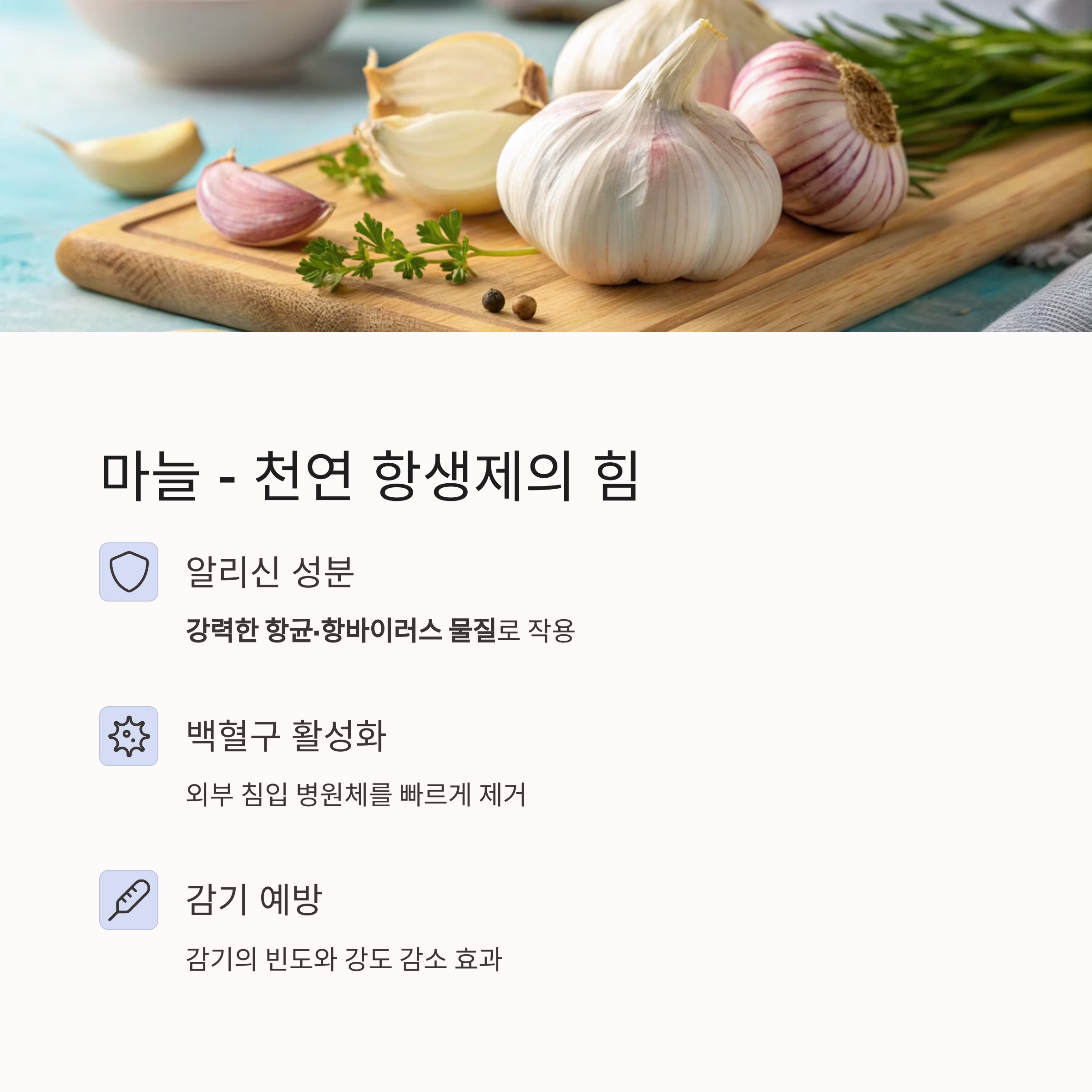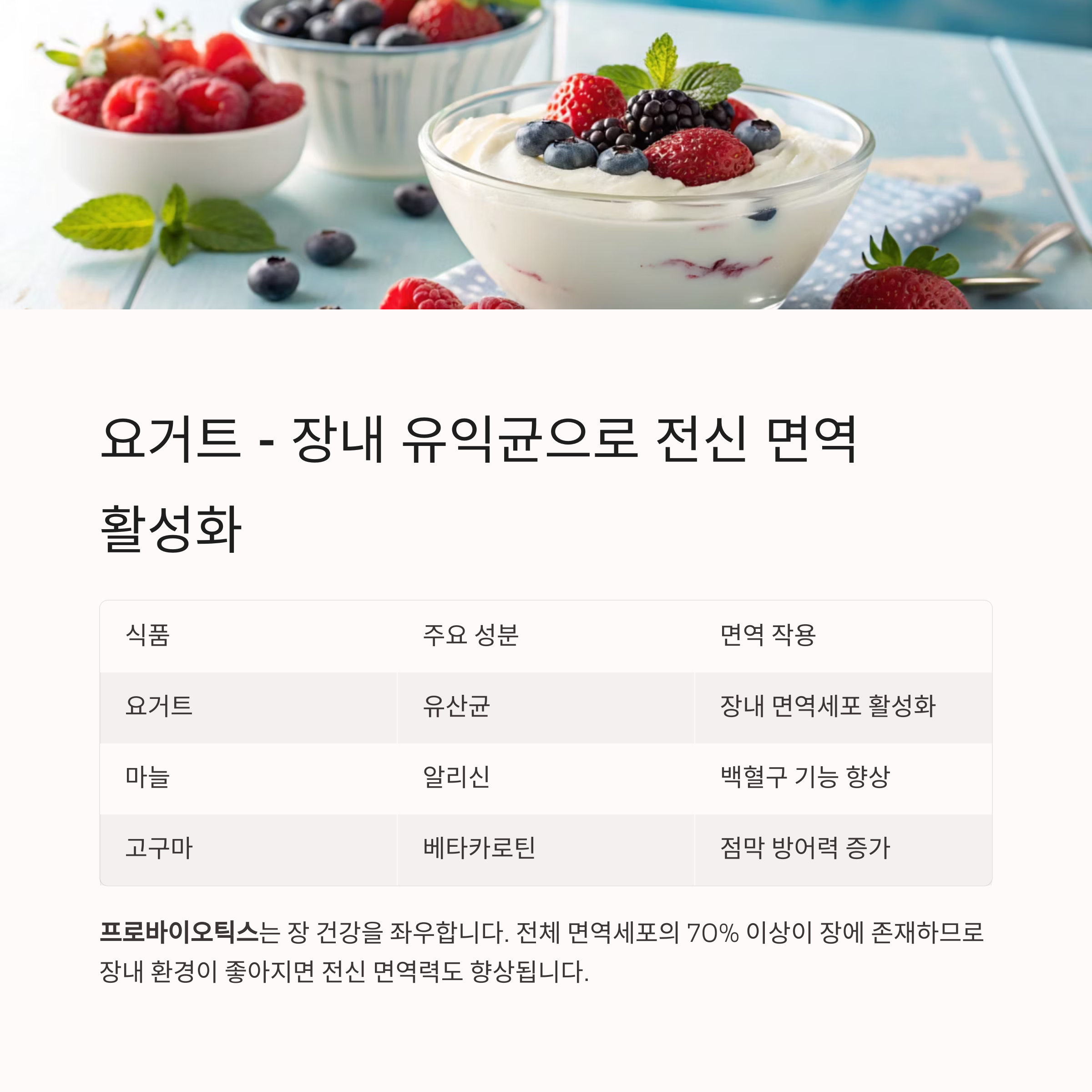 특히 마늘, 고등어, 버섯, 고구마, 요거트는 과학적으로도 효과가 입증된 면역 강화 식품입니다.
