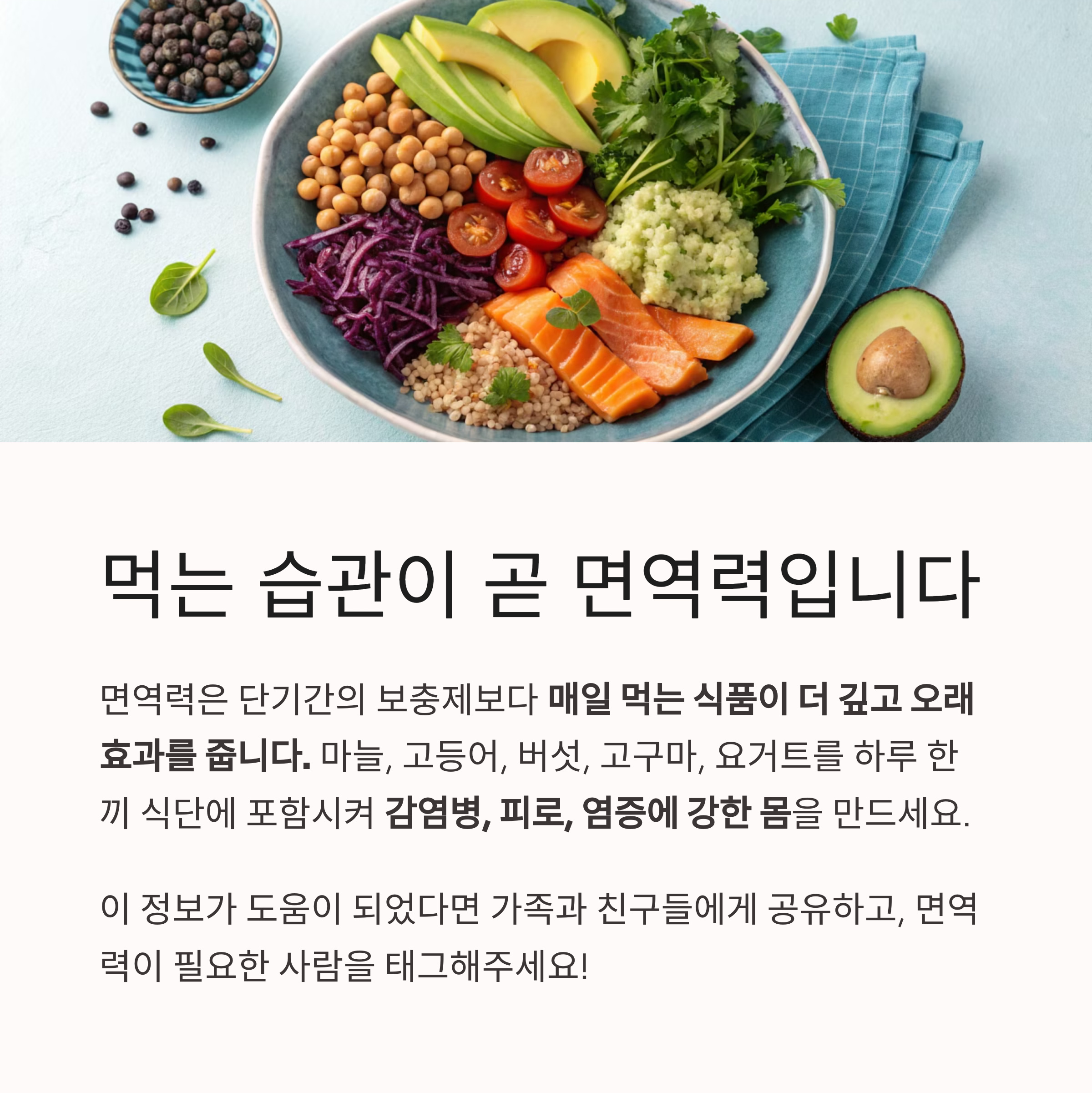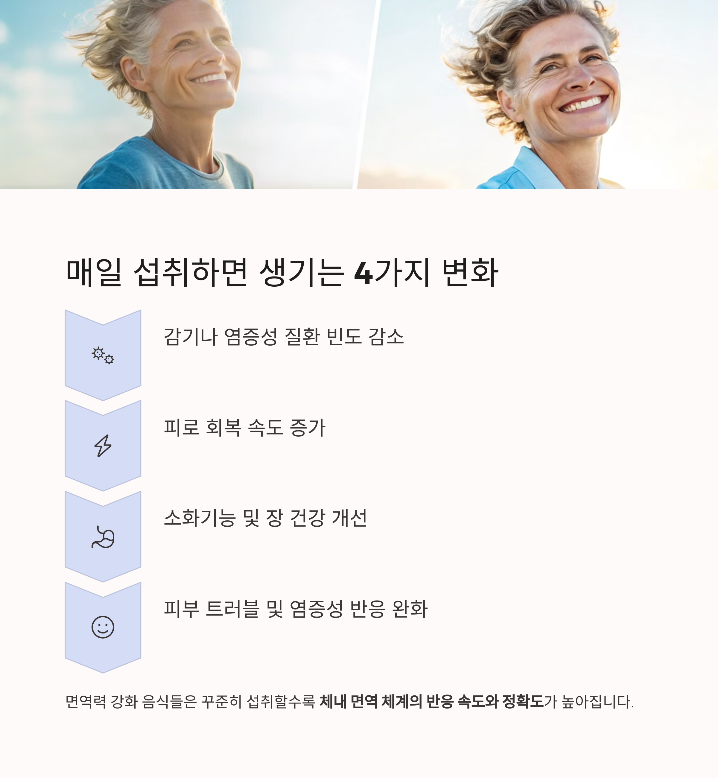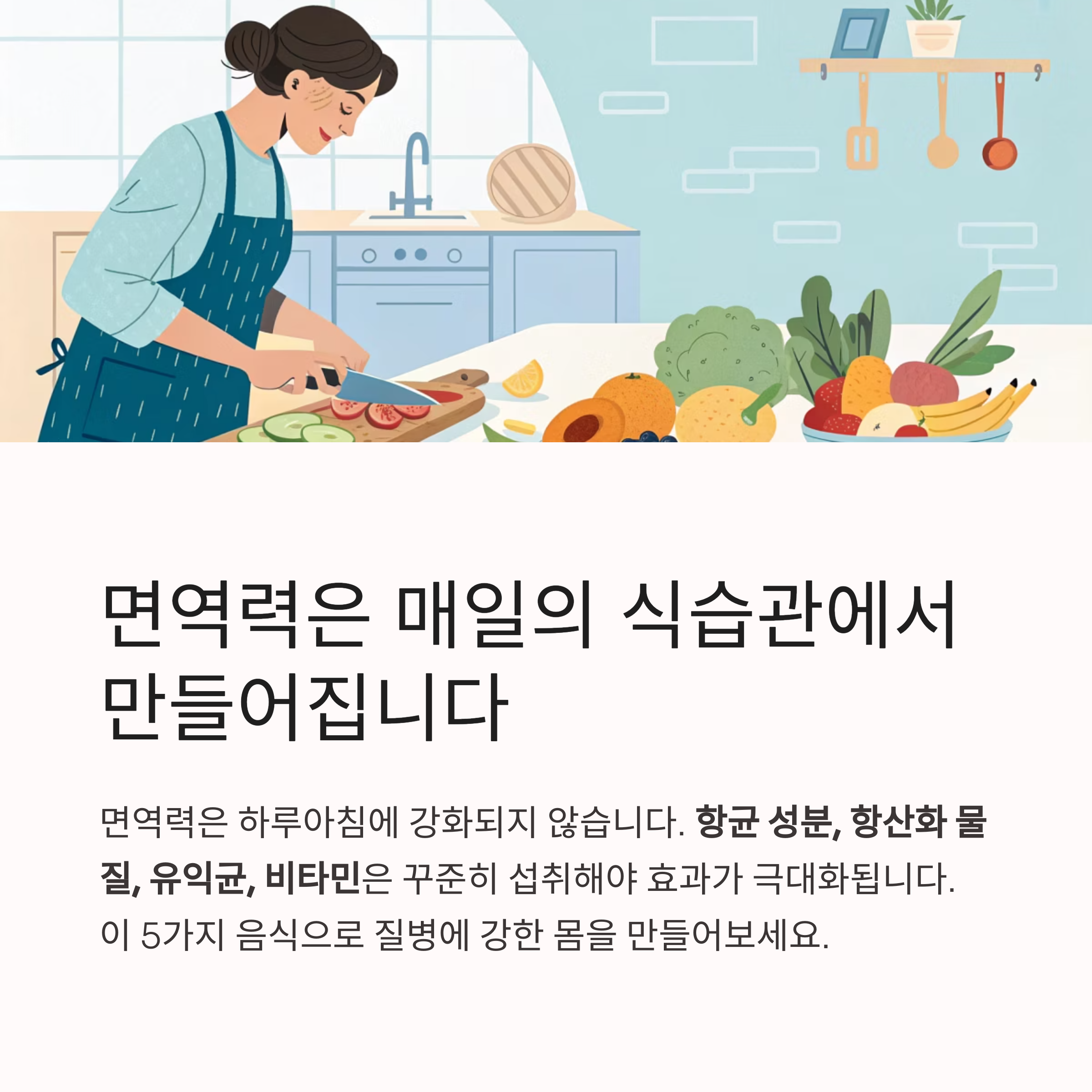 면역력은 단기간의 보충제보다 매일 먹는 식품이 더 깊고 오래 효과를 줍니다.
