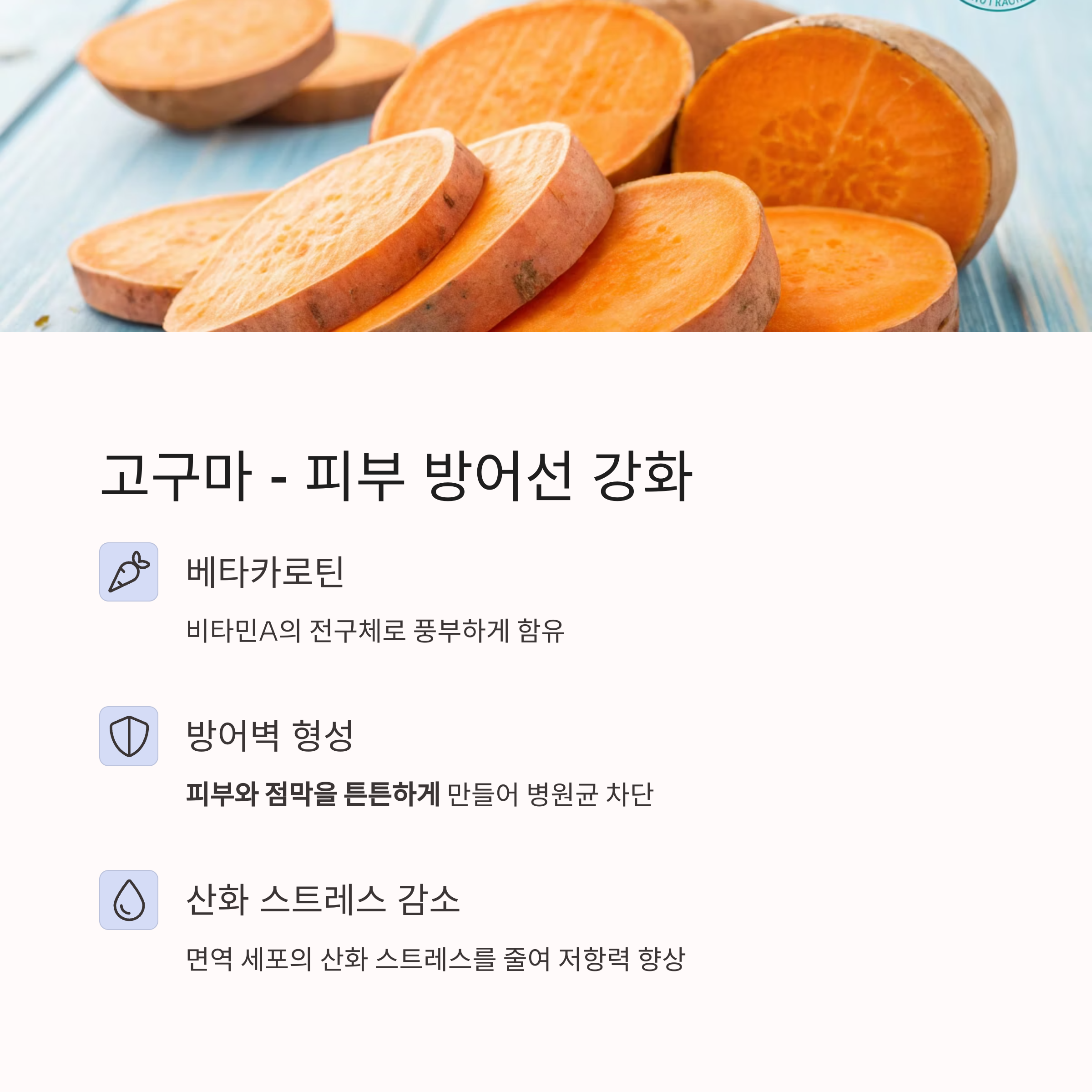 고구마 | 베타카로틴 | 점막 방어력 증가 |