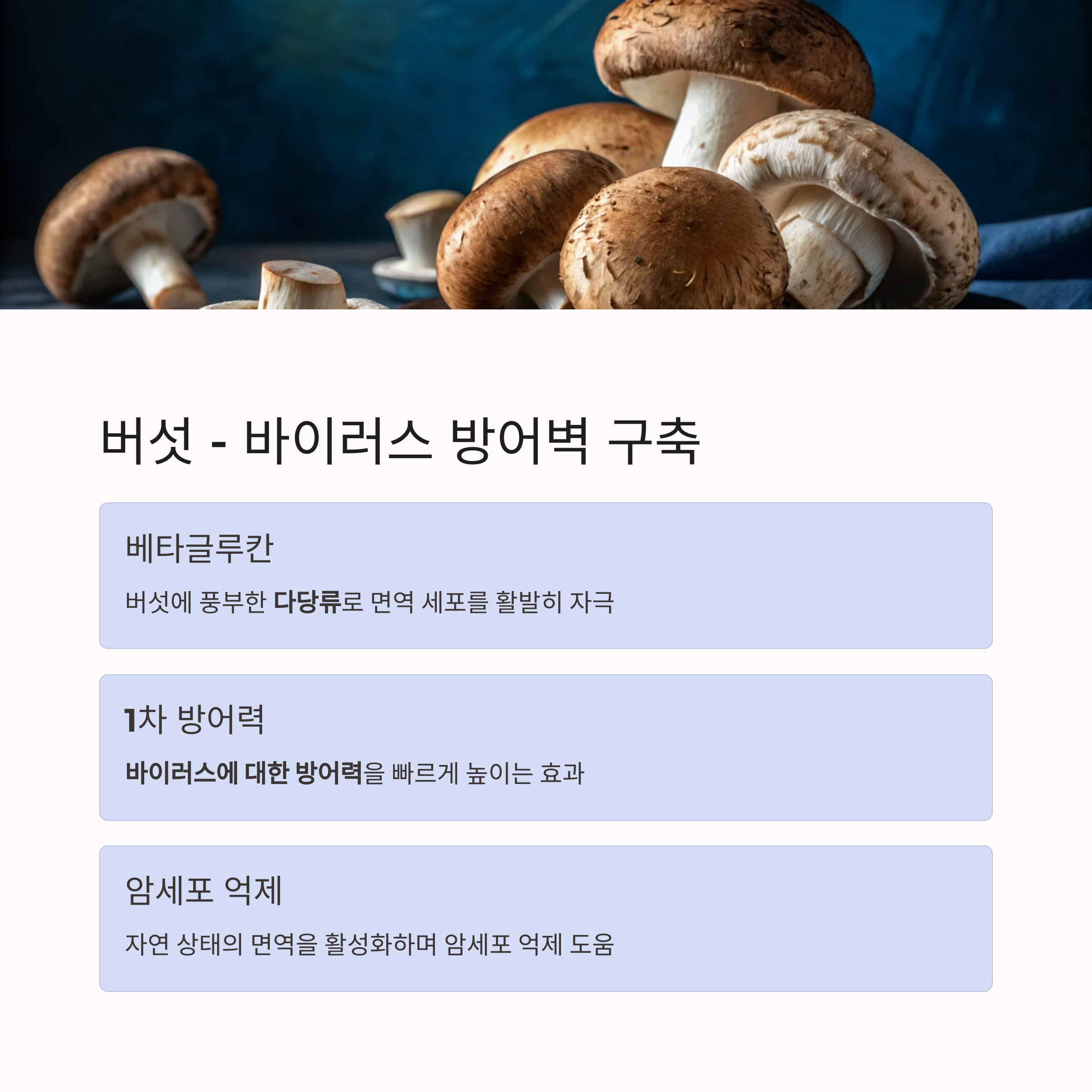 버섯에는 베타글루칸이라는 다당류가 풍부하여 면역 세포를 활발히 자극합니다.