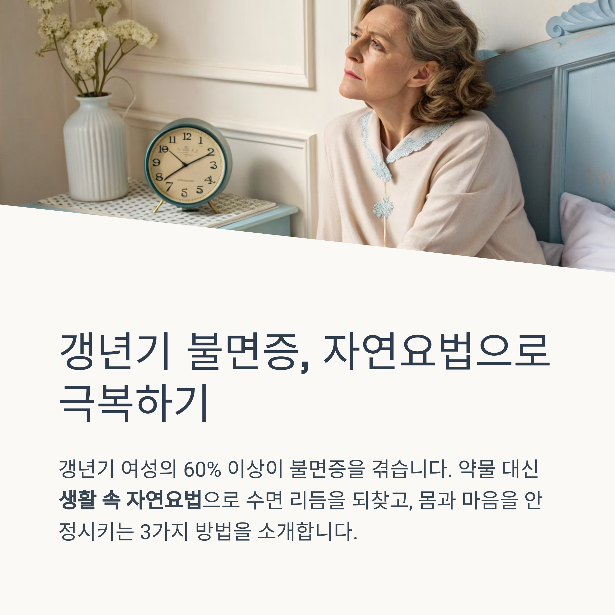 갱년기 여성의 60% 이상이 불면증을 겪는다는 통계가 있습니다.