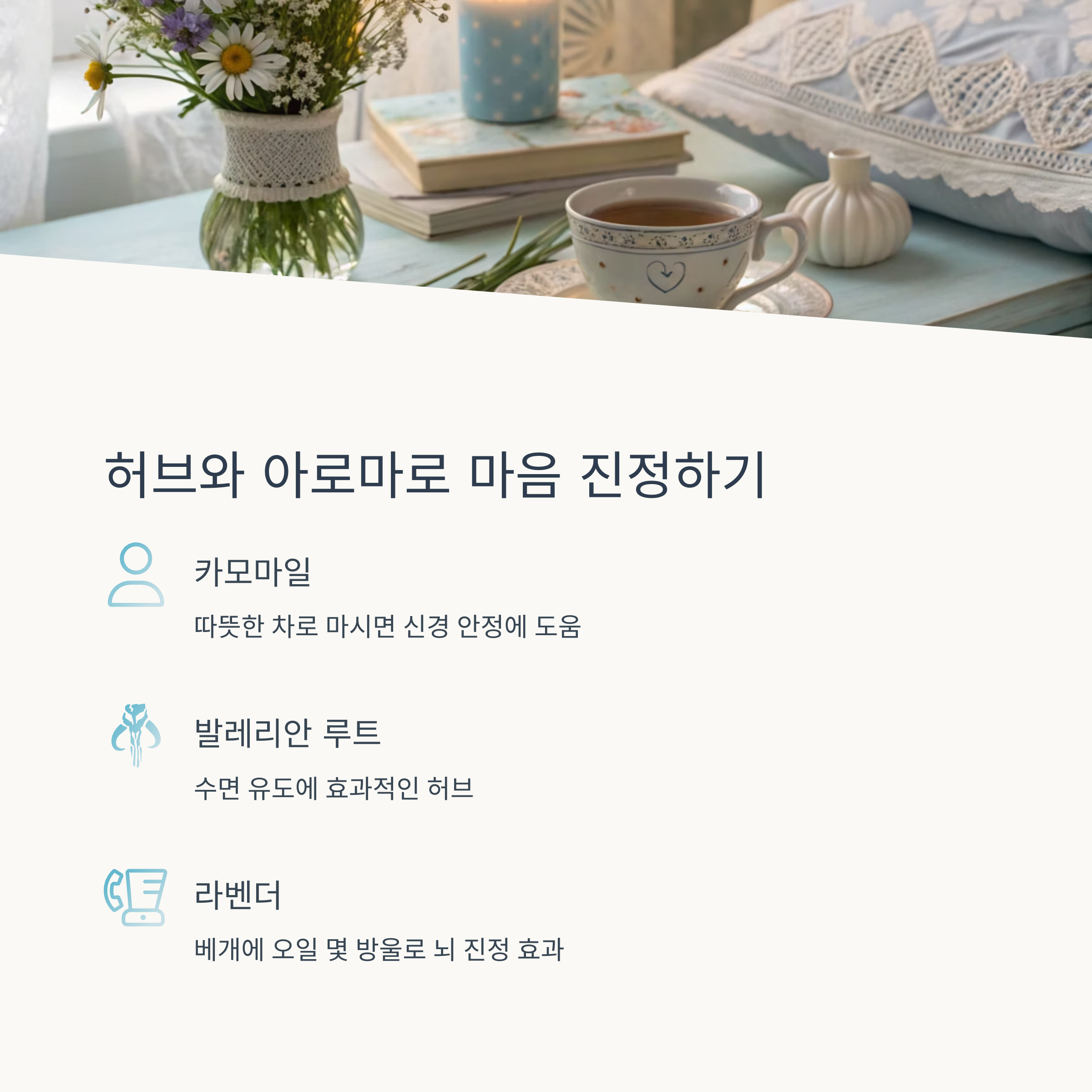 카모마일, 발레리안 루트(쥐오줌풀), 라벤더는 대표적인 수면 유도 허브입니다.