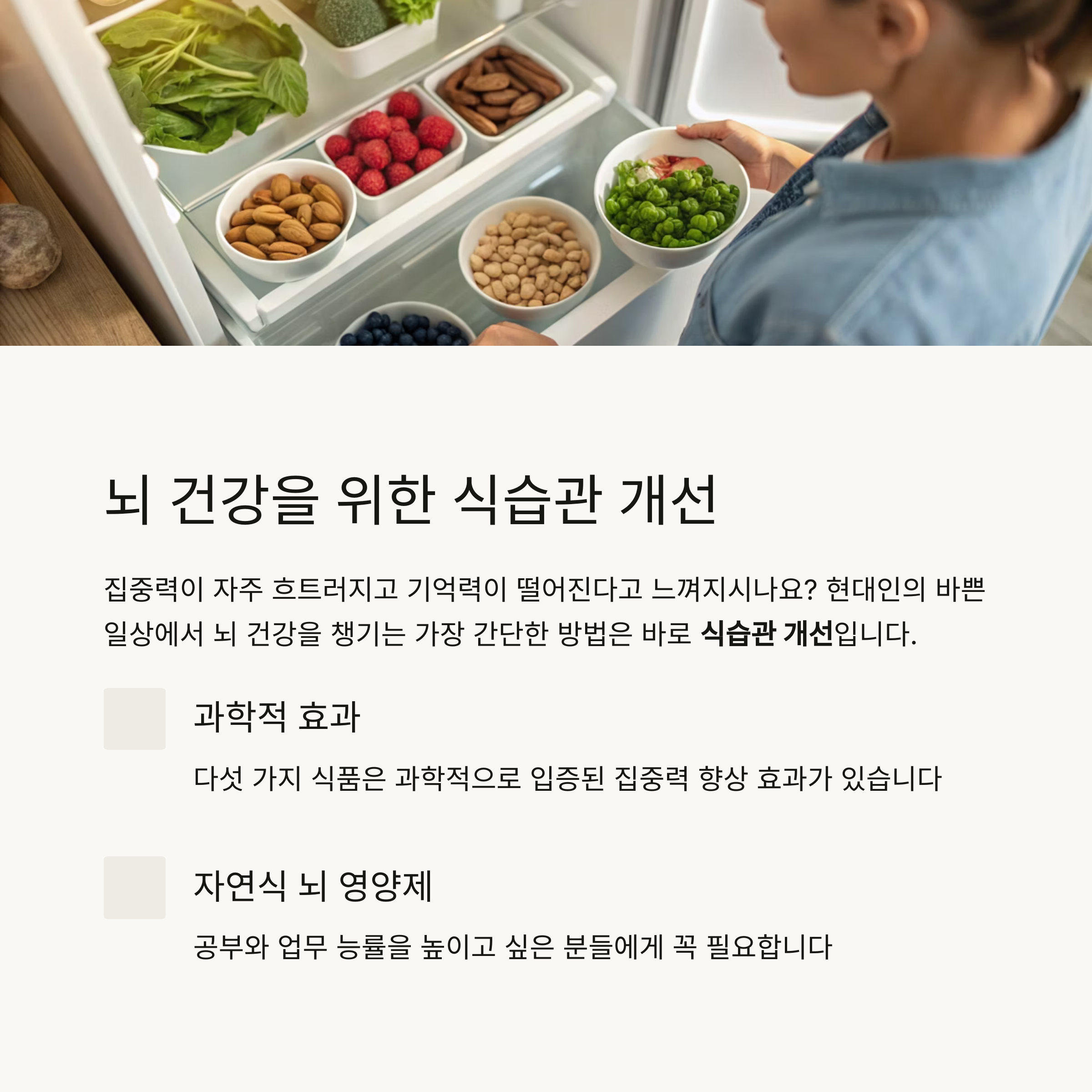 현대인의 바쁜 일상에서 뇌 건강을 챙기는 가장 간단한 방법은 바로 식습관 개선입니다.
