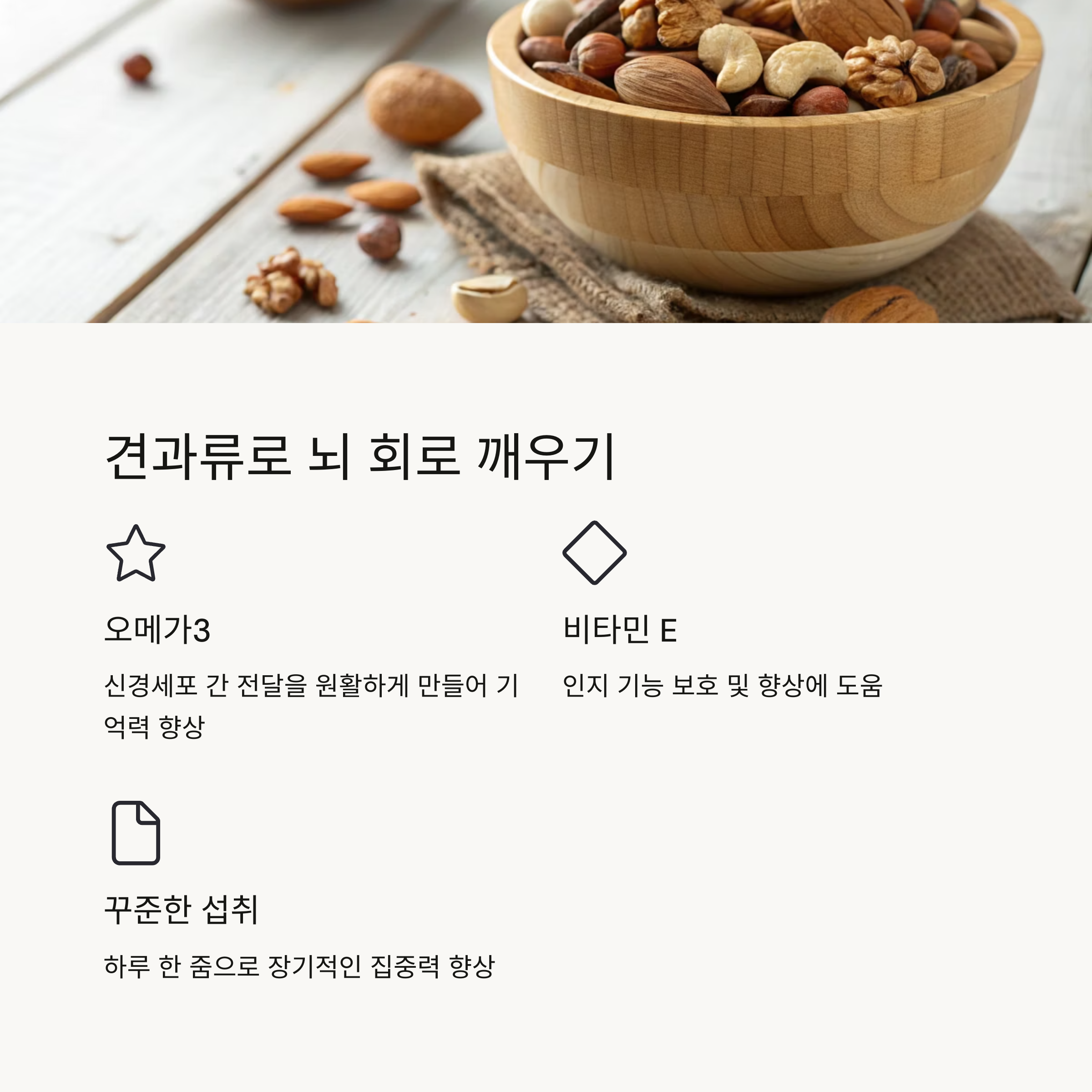 간식으로 하루 한 줌, 꾸준한 섭취가 장기적인 집중력 향상에 효과적입니다.