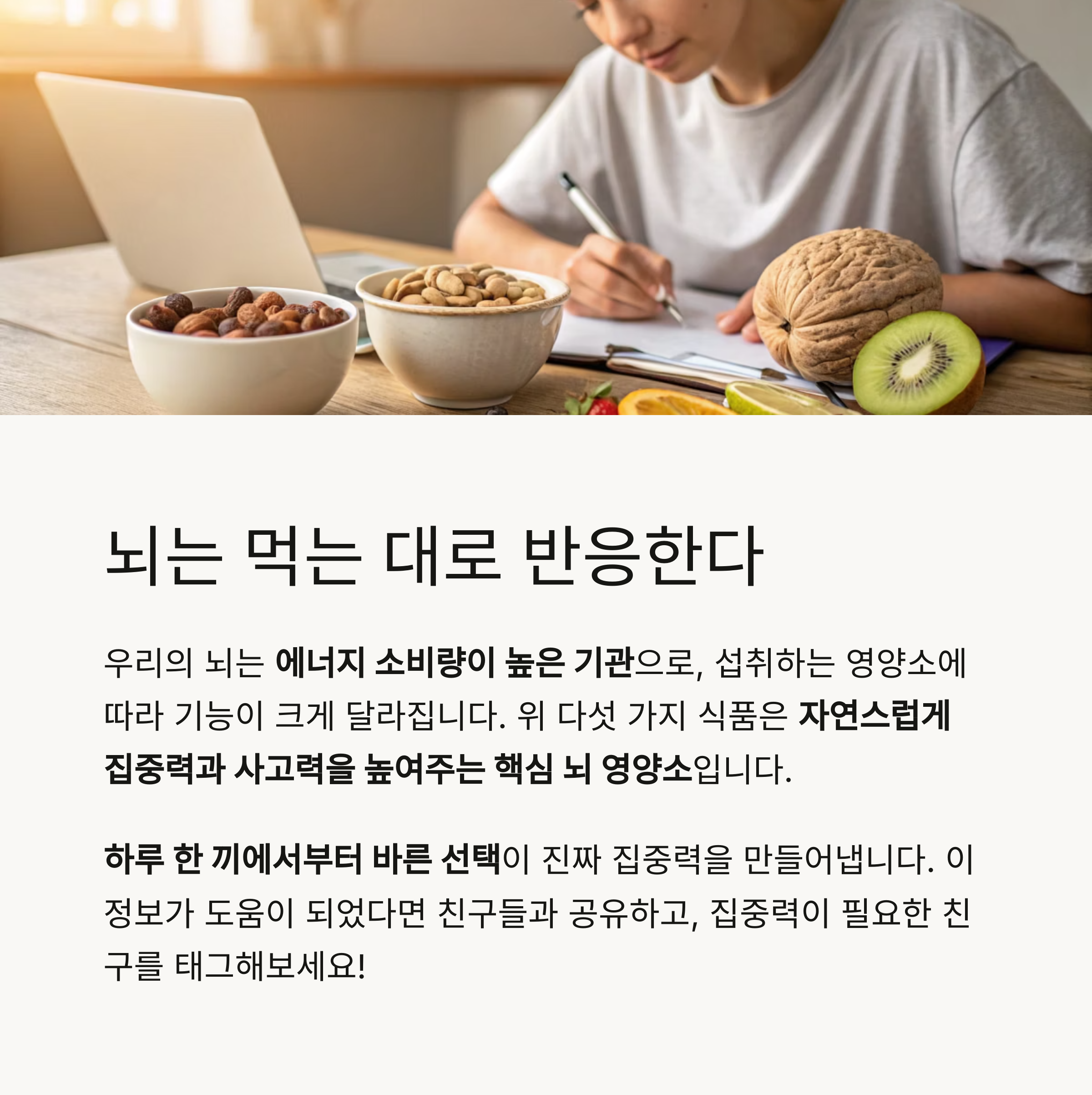 위 다섯 가지 식품은 자연스럽게 집중력과 사고력을 높여주는 핵심 뇌 영양소입니다.