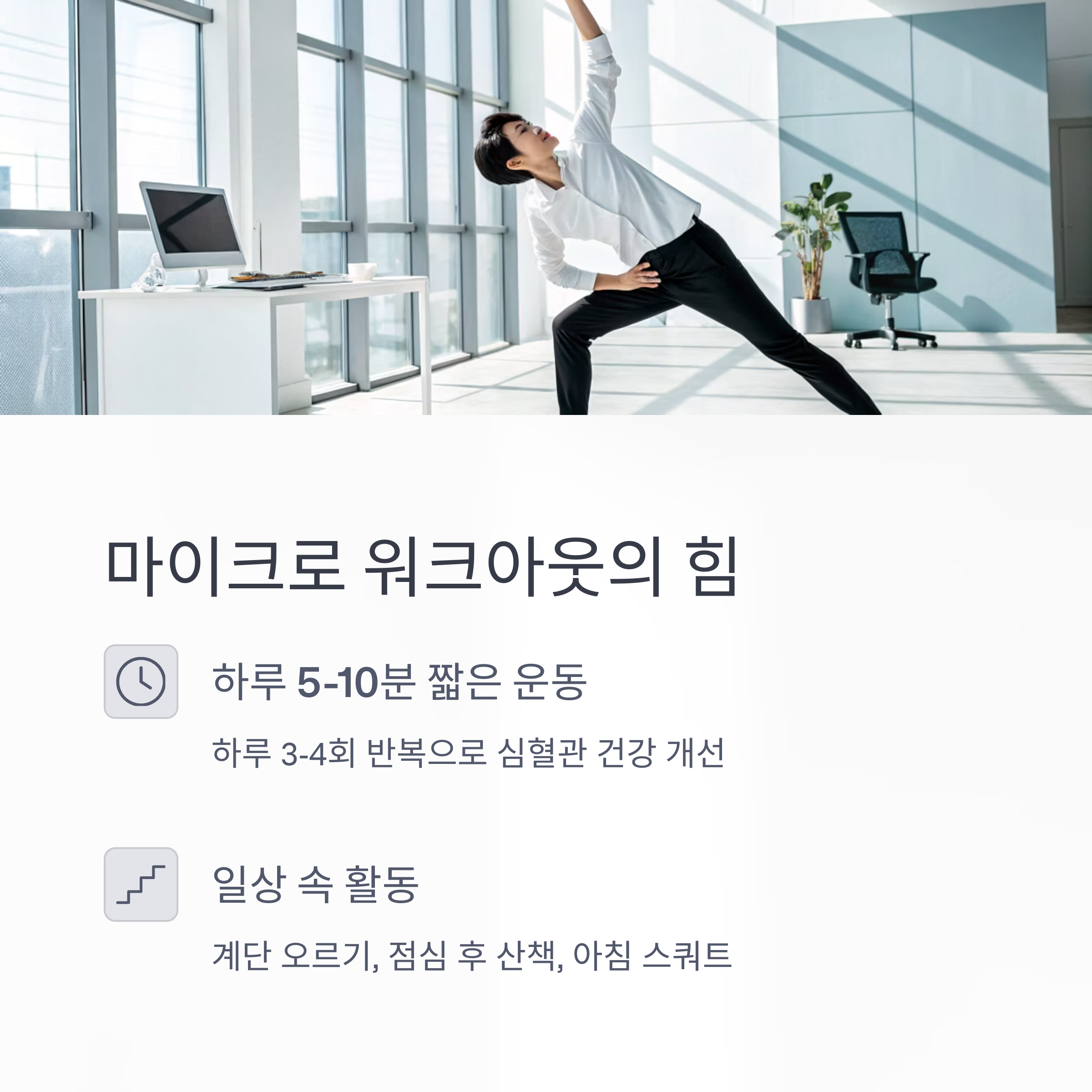 아침에 스쿼트 10회 등 작지만 꾸준한 활동이 핵심입니다.
